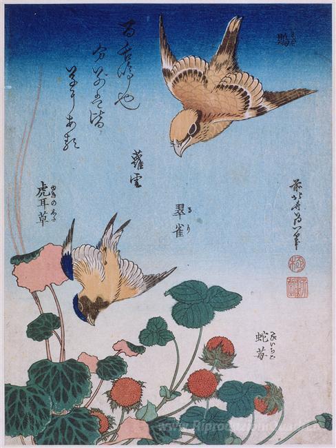 Ti offriamo una riproduzione artigianale su tela dell'opera famosa 'Ingoiare e begonia e fragola torta' di Katsushika Hokusai, dal Museo delle Riproduzioni.