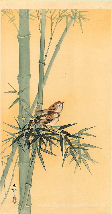 Ti offriamo una riproduzione artigianale su tela dell'opera famosa 'Passeri sull'albero di bambù' di Ohara Koson, dal Museo delle Riproduzioni.