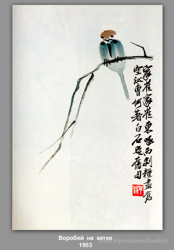 Ti offriamo una riproduzione artigianale su tela dell'opera famosa 'Passero su un ramo' di Qi Baishi, dal Museo delle Riproduzioni.