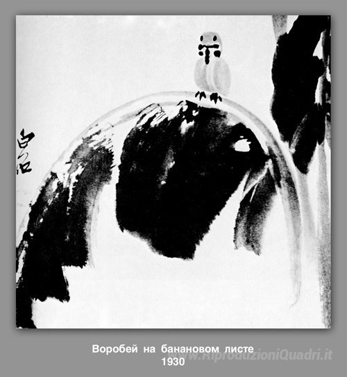 Ti offriamo una riproduzione artigianale su tela dell'opera famosa 'Passero su una foglia di banana' di Qi Baishi, dal Museo delle Riproduzioni.