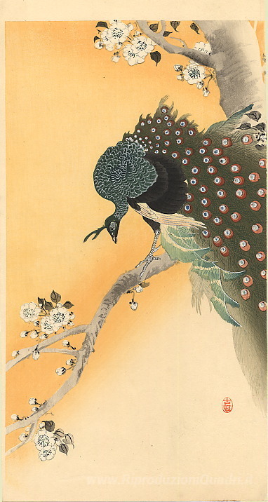 Ti offriamo una riproduzione artigianale su tela dell'opera famosa 'Peacock' di Ohara Koson, dal Museo delle Riproduzioni.
