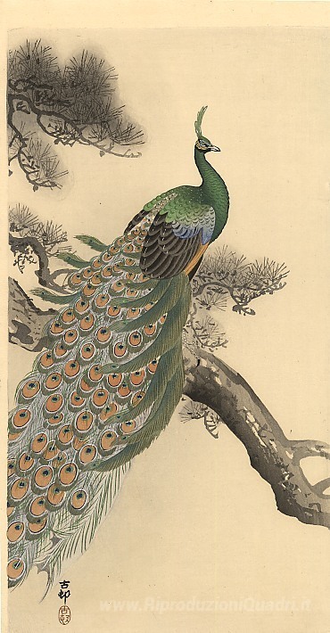 Ti offriamo una riproduzione artigianale su tela dell'opera famosa 'Peacock' di Ohara Koson, dal Museo delle Riproduzioni.