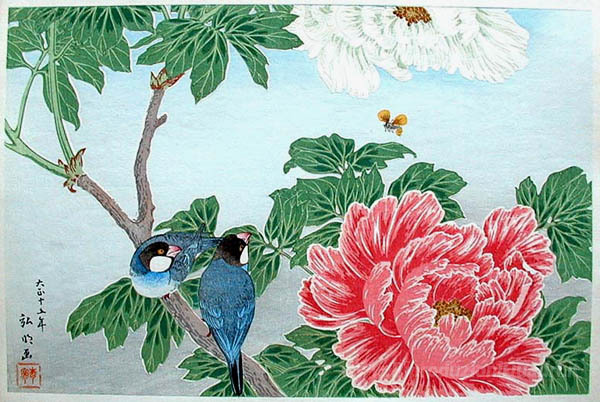Ti offriamo una riproduzione artigianale su tela dell'opera famosa 'Peonia e Paddy-birds' di Shotei Takahashi, dal Museo delle Riproduzioni.