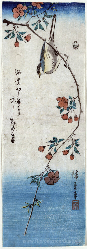 Ti offriamo una riproduzione artigianale su tela dell'opera famosa 'Piccolo uccello su un ramo di Kaidozakura' di Hiroshige, dal Museo delle Riproduzioni.