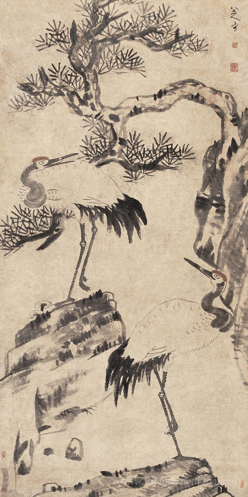 Ti offriamo una riproduzione artigianale su tela dell'opera famosa 'Pino e gru' di Bada Shanren, dal Museo delle Riproduzioni.