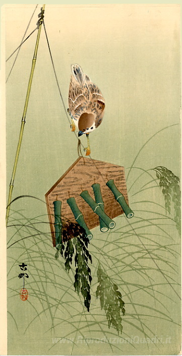 Ti offriamo una riproduzione artigianale su tela dell'opera famosa 'Sparrow e Spaventapasseri' di Ohara Koson, dal Museo delle Riproduzioni.