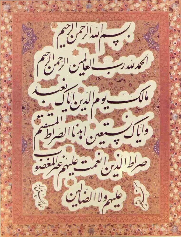 Ti offriamo una riproduzione artigianale su tela dell'opera famosa 'Al-Fatiha' di Mir Emad Hassani, dal Museo delle Riproduzioni.