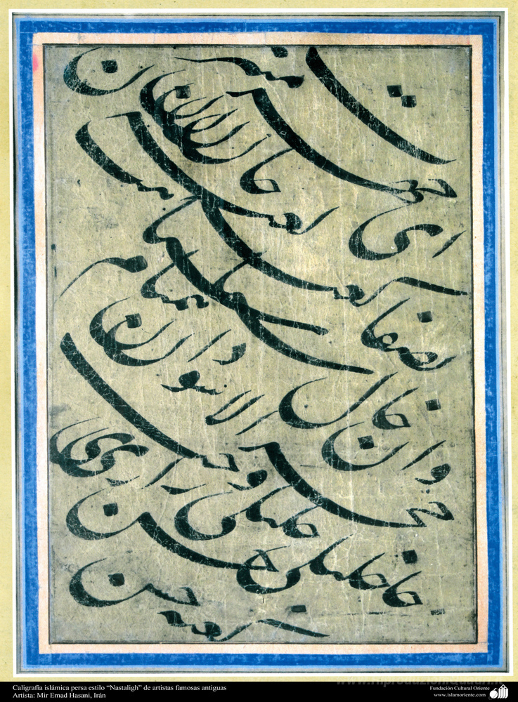 Benvenuti nel mondo straordinario della pittura a olio, dove l'arte si fonde con l'emozione e ogni opera racconta una storia unica. Tra le nostre eccellenze, vi presentiamo il dipinto Calligrafia dell'illustre artista Mir Emad Hassani, un maestro della calligrafia persiana che unisce tradizione e innovazione. Ogni pennellata di questo capolavoro è una celebrazione della bellezza delle forme e della fluidità delle linee, trasportando l'osservatore in un viaggio visivo senza tempo.