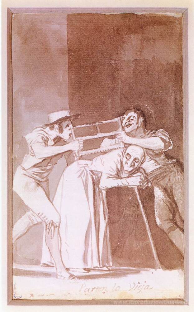 Ti offriamo una riproduzione artigianale su tela dell'opera famosa 'Condivisione della Vecchia' di Francisco Goya, dal Museo delle Riproduzioni.