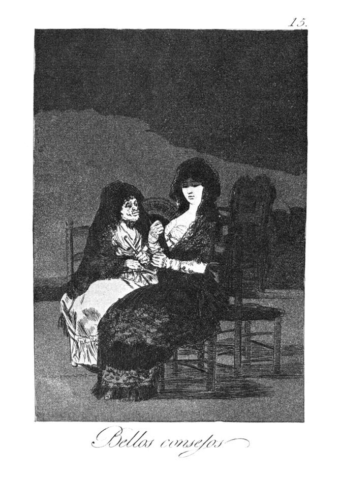 Ti offriamo una riproduzione artigianale su tela dell'opera famosa 'Consigli Belle' di Francisco Goya, dal Museo delle Riproduzioni.