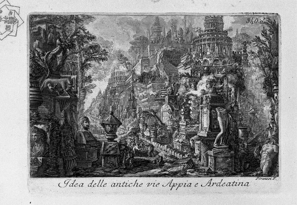Ti offriamo una riproduzione artigianale su tela dell'opera famosa 'Idea dell'antica via Appia e Ardeatina' di Giovanni Battista Piranesi, dal Museo delle Riproduzioni.