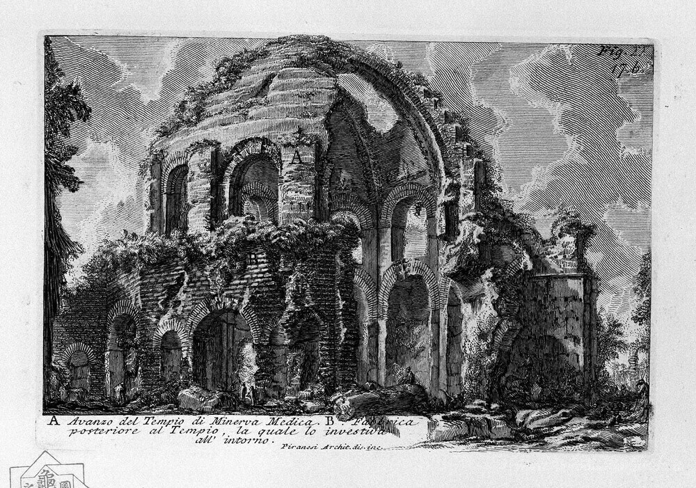 Ti offriamo una riproduzione artigianale su tela dell'opera famosa 'Le antichità romane, t. 1, Piatto XVI. Tempio di Minerva Medica.' di Giovanni Battista Piranesi, dal Museo delle Riproduzioni.