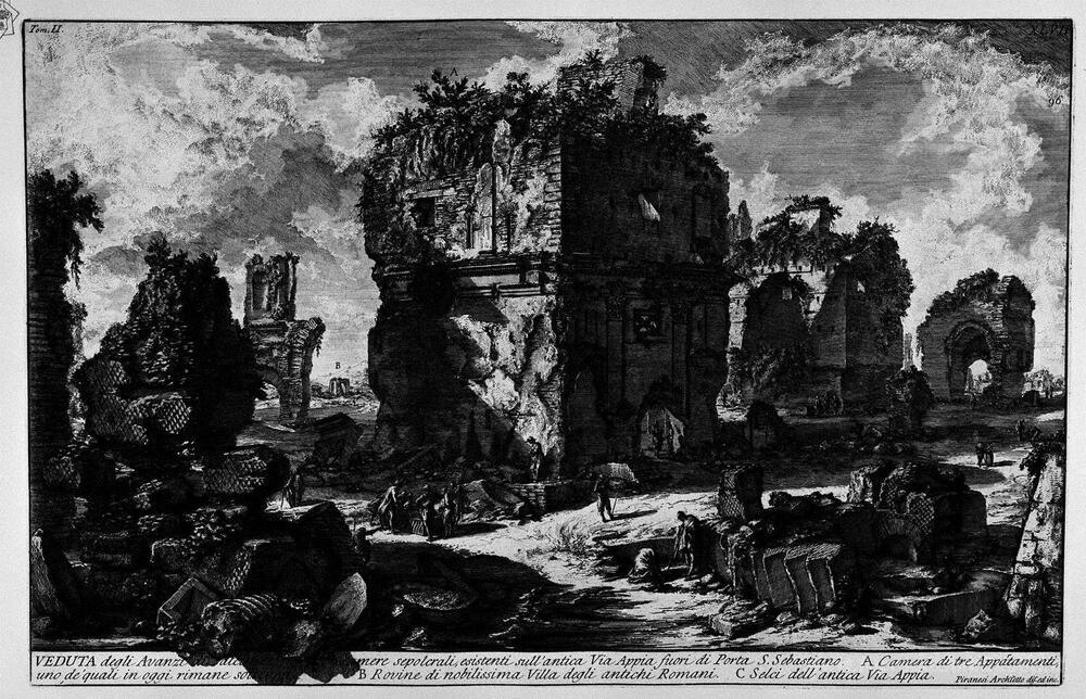 Ti offriamo una riproduzione artigianale su tela dell'opera famosa 'Le antichità romane, t. 2, Piatto XLVII. Guarda i resti di alcun' di Giovanni Battista Piranesi, dal Museo delle Riproduzioni.