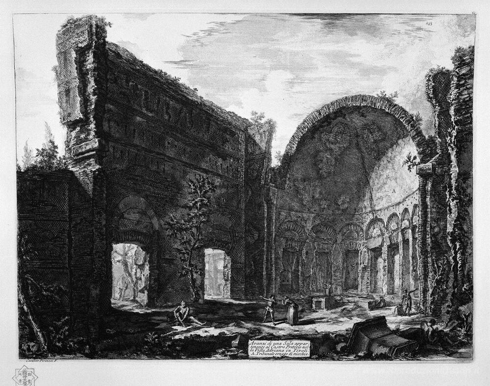 Ti offriamo una riproduzione artigianale su tela dell'opera famosa 'Resti di una sala appartenente alla Villa Adriana Castro Pretori' di Giovanni Battista Piranesi, dal Museo delle Riproduzioni.