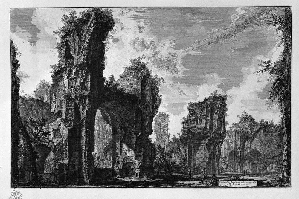 Ti offriamo una riproduzione artigianale su tela dell'opera famosa 'Rovine di Sisto, o di entrambi gli sala grande del Terme di Anto' di Giovanni Battista Piranesi, dal Museo delle Riproduzioni.