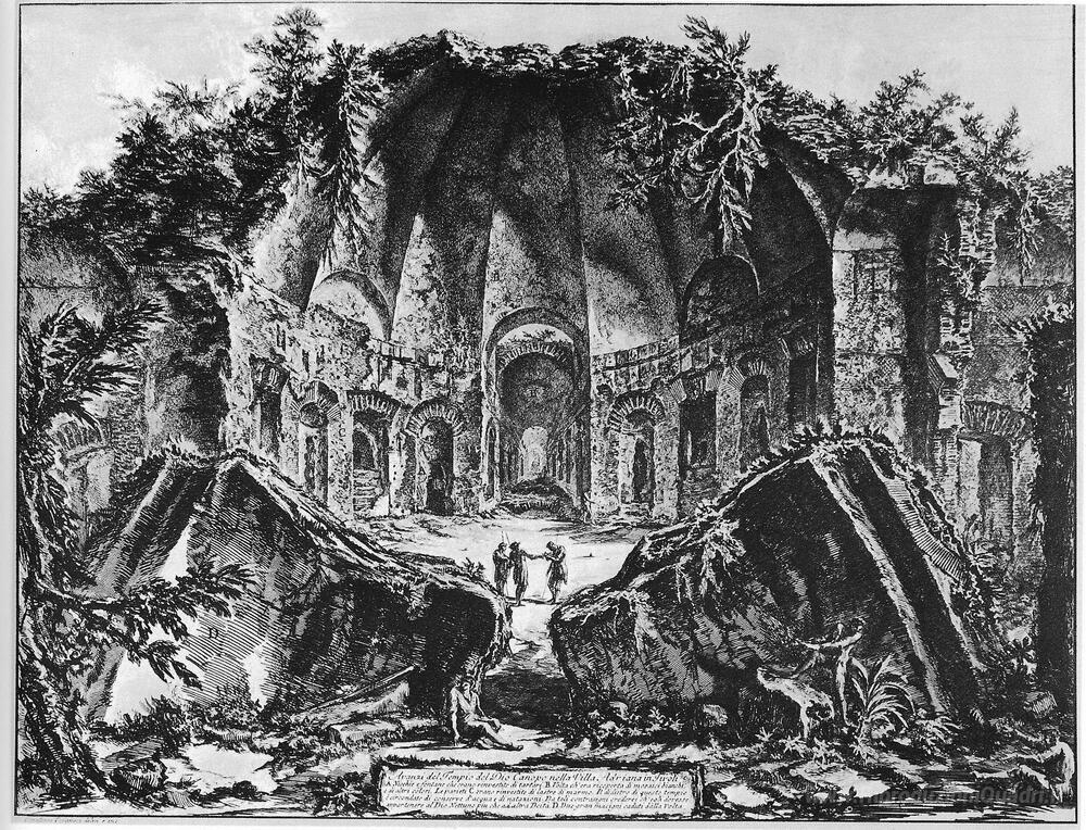 Ti offriamo una riproduzione artigianale su tela dell'opera famosa 'Vedute di Roma' di Giovanni Battista Piranesi, dal Museo delle Riproduzioni.