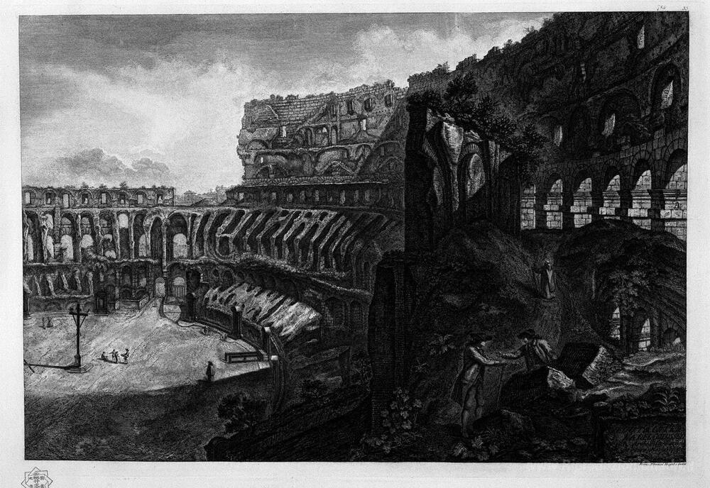 Ti offriamo una riproduzione artigianale su tela dell'opera famosa 'Vista interna del Colosseo' di Giovanni Battista Piranesi, dal Museo delle Riproduzioni.