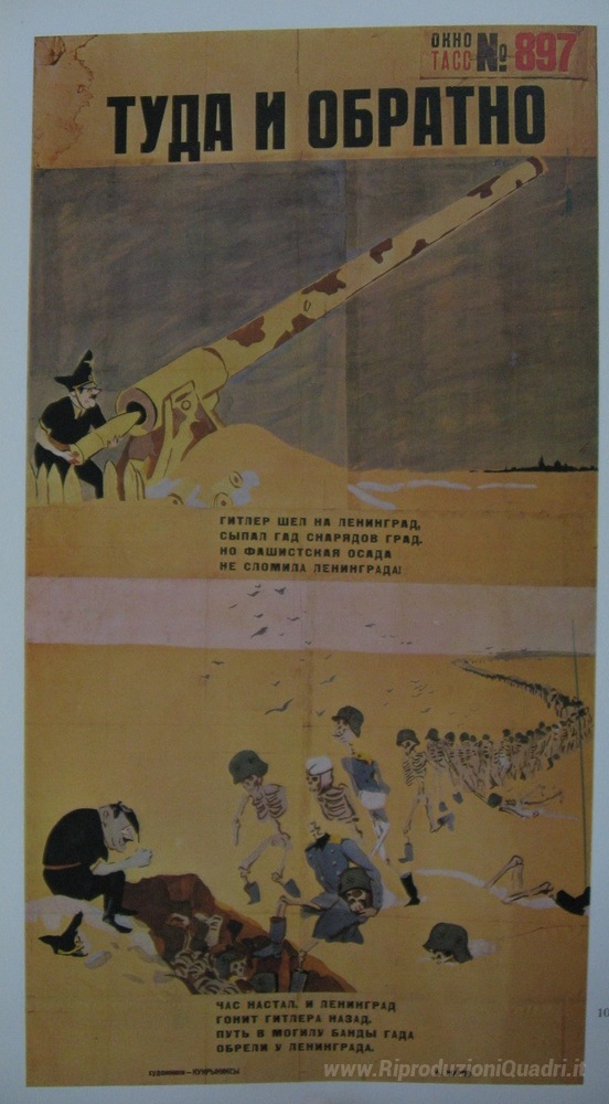 Ti offriamo una riproduzione artigianale su tela dell'opera famosa 'Avanti e indietro (Finestra TASS № 897)' di Kukryniksy, dal Museo delle Riproduzioni.