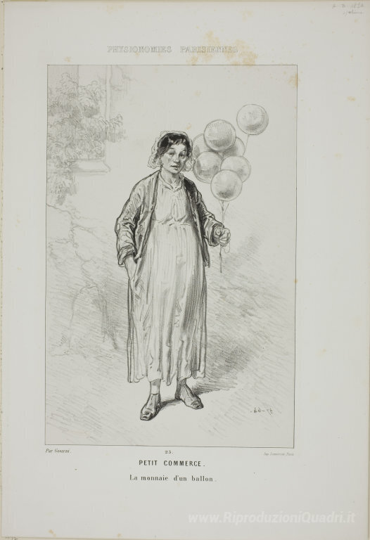 Ti offriamo una riproduzione artigianale su tela dell'opera famosa 'Fisionomie Parisiennes: Petit Commerce. La Monnaie d'Ballon un' di Paul Gavarni, dal Museo delle Riproduzioni.