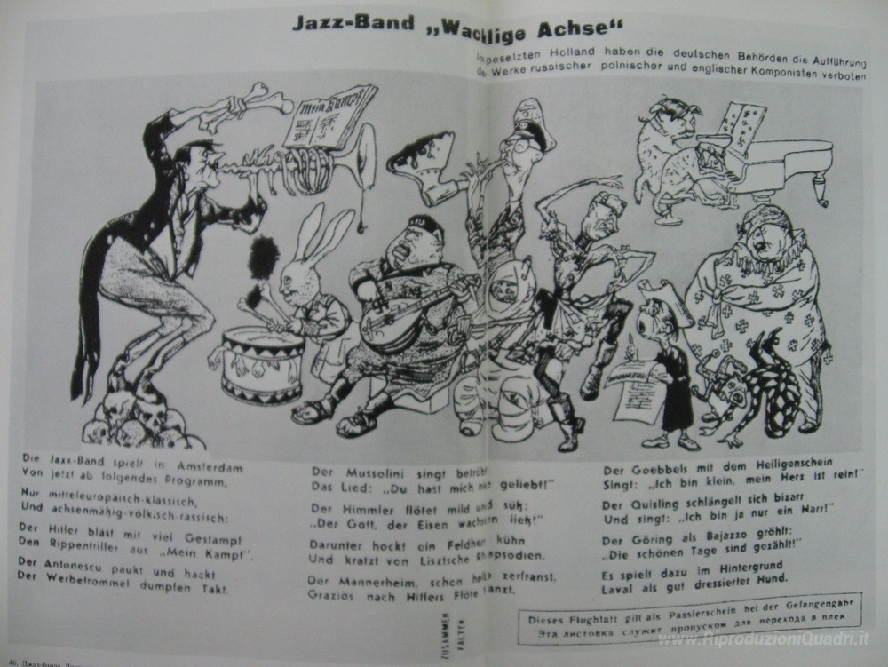 Ti offriamo una riproduzione artigianale su tela dell'opera famosa 'Jazz Band 'traballante Axis'' di Kukryniksy, dal Museo delle Riproduzioni.