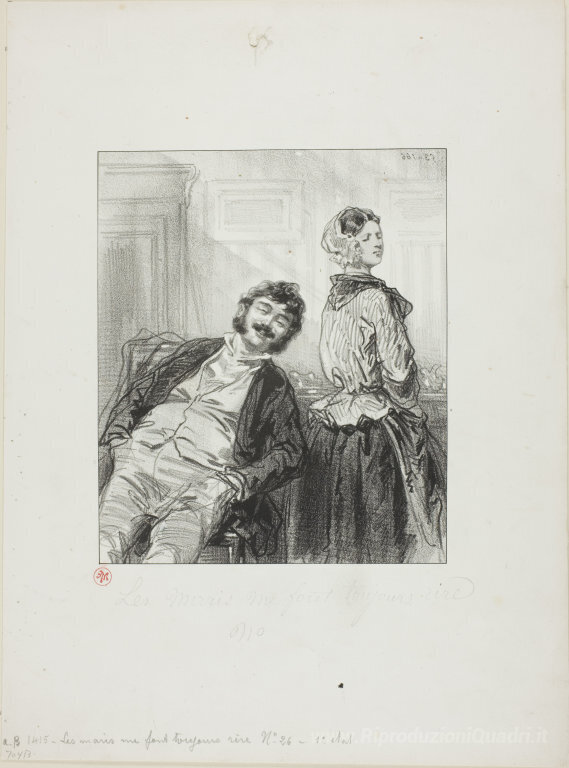 Ti offriamo una riproduzione artigianale su tela dell'opera famosa 'Mariti sempre mi fanno ridere: Vieni, Mme. Rabat-joie, zitto' di Paul Gavarni, dal Museo delle Riproduzioni.