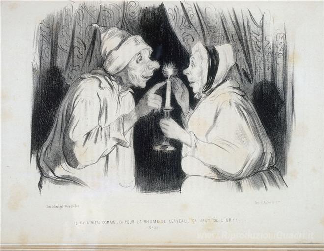 Ti offriamo una riproduzione artigianale su tela dell'opera famosa 'Non c'è nulla di simile per il comune raffreddore, che vale oro' di Honore Daumier, dal Museo delle Riproduzioni.