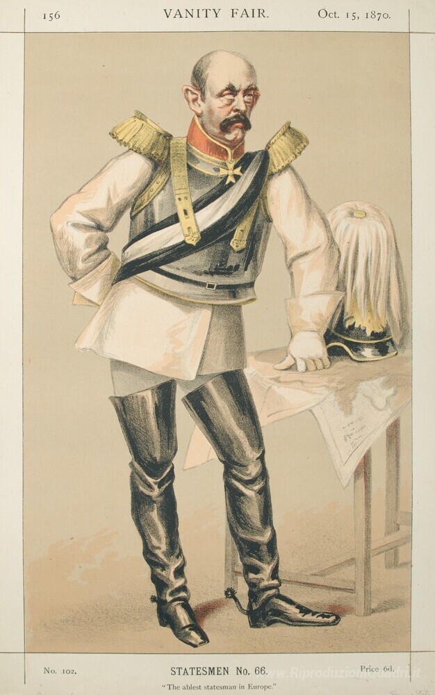 Ti offriamo una riproduzione artigianale su tela dell'opera famosa 'Statisti No.660 Caricatura del conte von Bismarck Schoenausen' di James Tissot, dal Museo delle Riproduzioni.