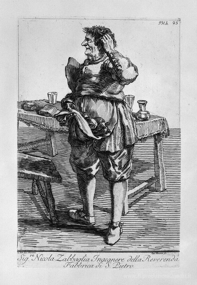 Ti offriamo una riproduzione artigianale su tela dell'opera famosa 'Zabaglia caricatura di Nicola, il reverendo Fabbrica di San inge' di Giovanni Battista Piranesi, dal Museo delle Riproduzioni.