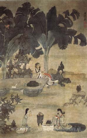 Ti offriamo una riproduzione artigianale su tela dell'opera famosa 'Bere vino nel giardino' di Chen Hongshou, dal Museo delle Riproduzioni.