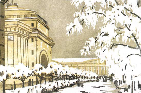 Ti offriamo una riproduzione artigianale su tela dell'opera famosa 'Admiralty sotto la neve' di Anna Ostroumova-Lebedeva, dal Museo delle Riproduzioni.