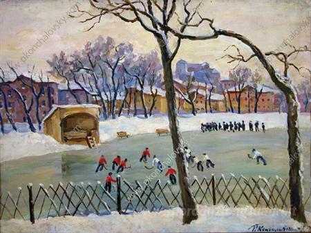 Ti offriamo una riproduzione artigianale su tela dell'opera famosa 'Alla pista di pattinaggio' di Pyotr Konchalovsky, dal Museo delle Riproduzioni.
