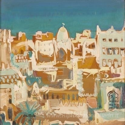 Ti offriamo una riproduzione artigianale su tela dell'opera famosa 'Arabian Città' di Walter Battiss, dal Museo delle Riproduzioni.