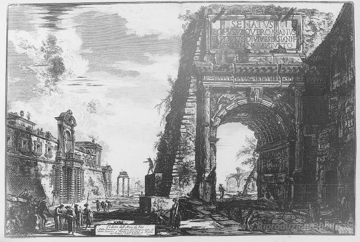 Ti offriamo una riproduzione artigianale su tela dell'opera famosa 'Arco de Tito' di Giovanni Battista Piranesi, dal Museo delle Riproduzioni.