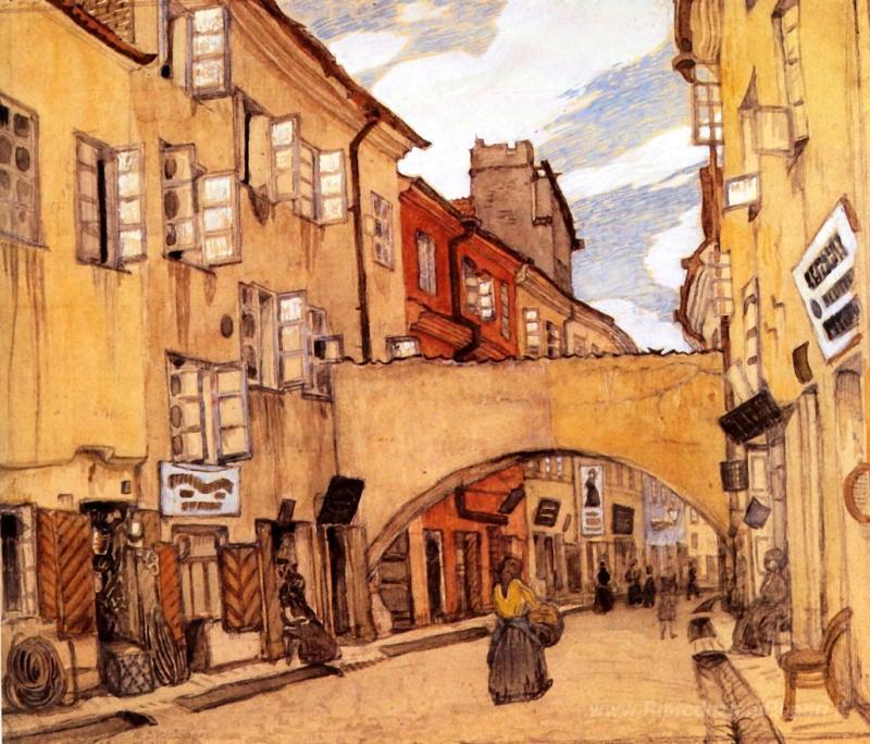 Ti offriamo una riproduzione artigianale su tela dell'opera famosa 'Arco sulla strada Yatkovaya' di Mstislav Dobuzhinsky, dal Museo delle Riproduzioni.