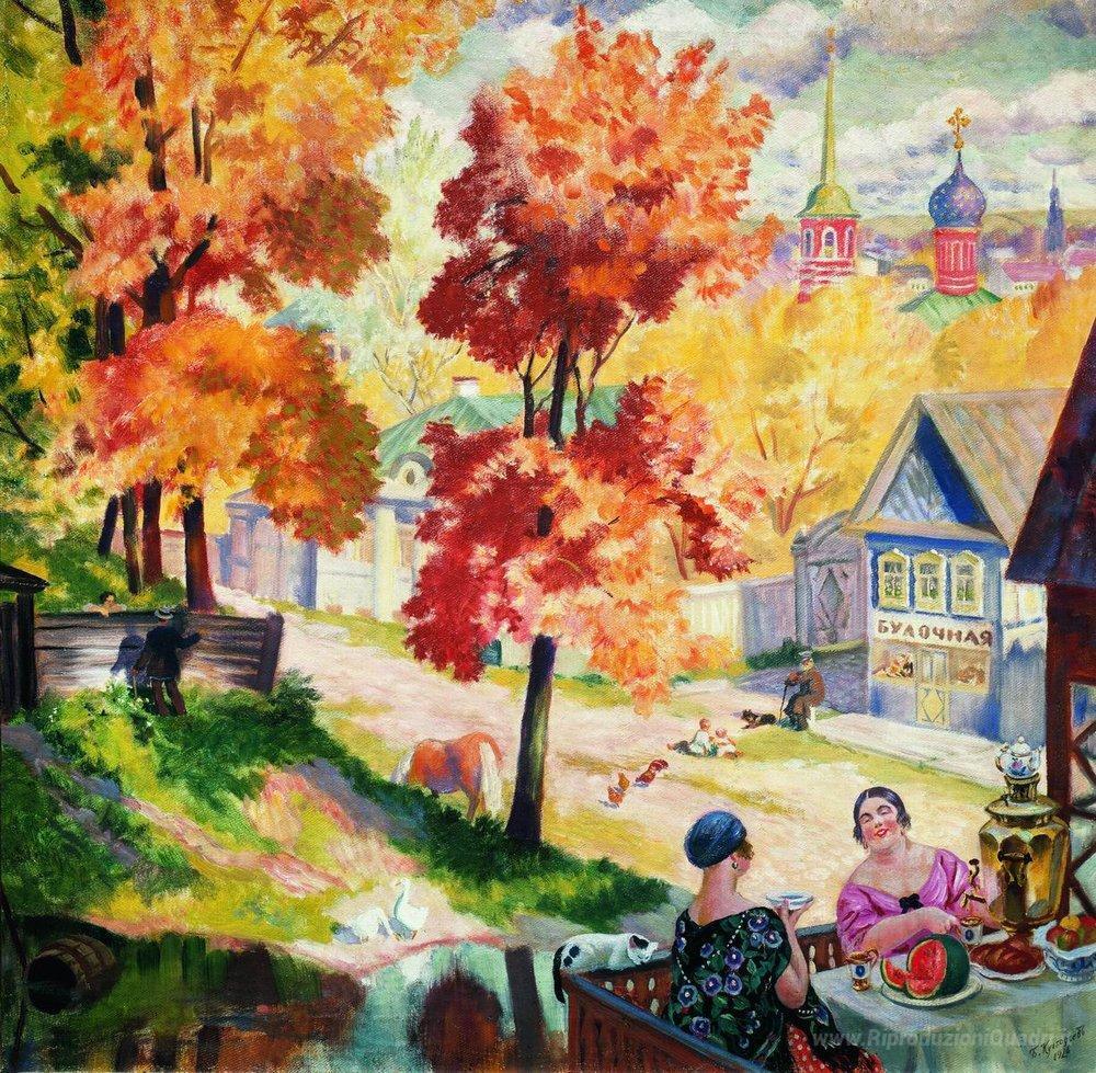 Ti offriamo una riproduzione artigianale su tela dell'opera famosa 'Autunno in provincia. Ora del tè' di Boris Kustodiev, dal Museo delle Riproduzioni.