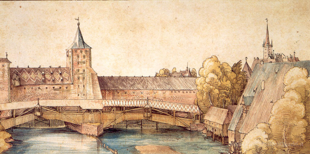 Ti offriamo una riproduzione artigianale su tela dell'opera famosa 'Bacino di carenaggio a Hallertürlein, Norimberga' di Albrecht Durer, dal Museo delle Riproduzioni.
