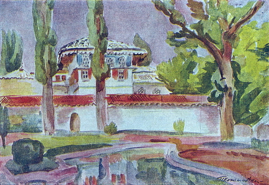 Ti offriamo una riproduzione artigianale su tela dell'opera famosa 'Bakhchisarai. Palazzo di Khan.' di Pyotr Konchalovsky, dal Museo delle Riproduzioni.