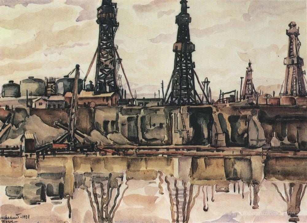 Ti offriamo una riproduzione artigianale su tela dell'opera famosa 'Baku. Piattaforme petrolifere.' di Konstantin Bogaevsky, dal Museo delle Riproduzioni.