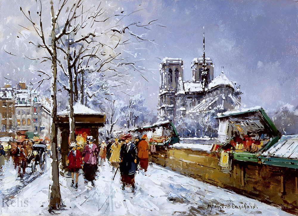 Ti offriamo una riproduzione artigianale su tela dell'opera famosa 'Booksellers Notre Dame, Inverno' di Antoine Blanchard, dal Museo delle Riproduzioni.