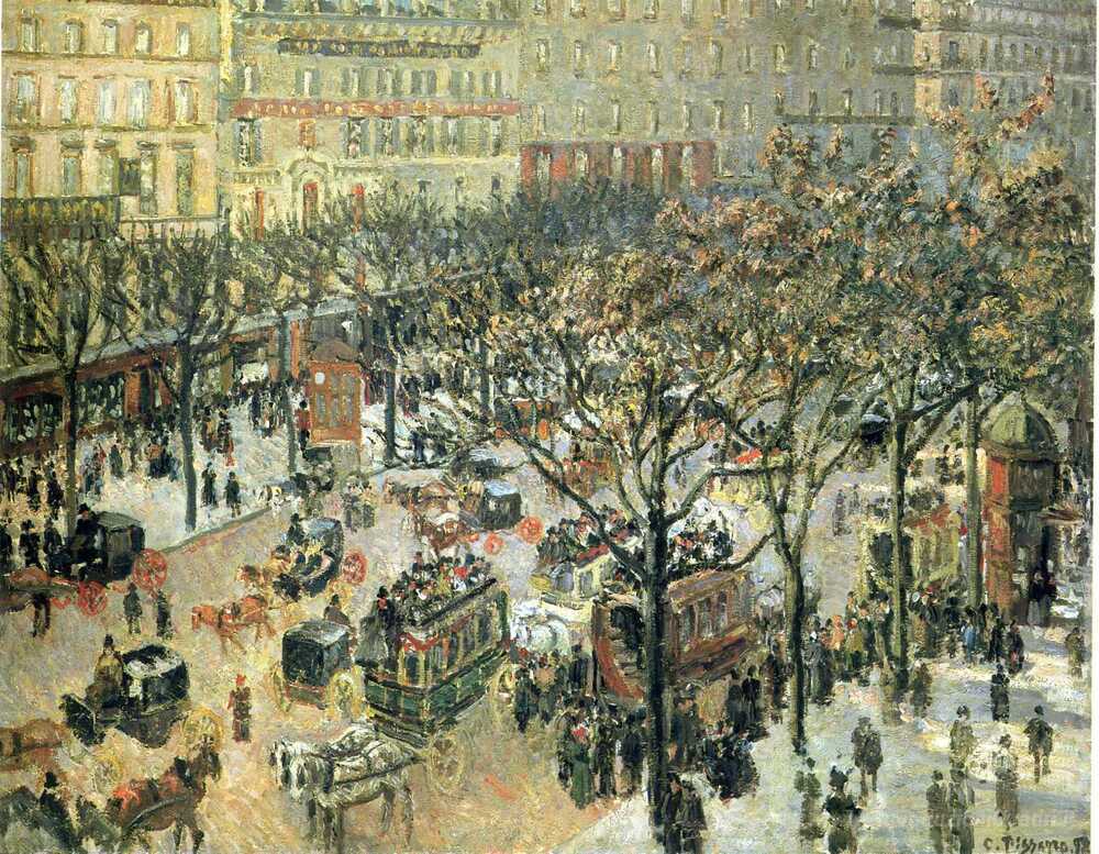 Ti offriamo una riproduzione artigianale su tela dell'opera famosa 'Boulevard des Italiens Mattina, Luce solare' di Camille Pissarro, dal Museo delle Riproduzioni.