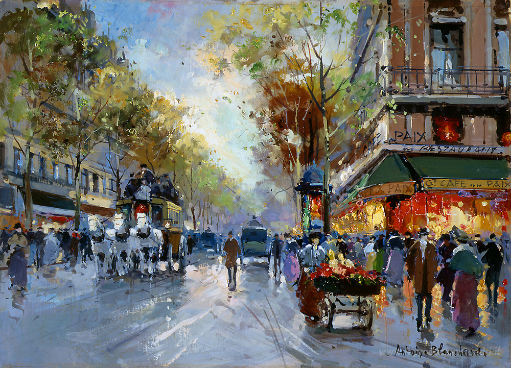 Ti offriamo una riproduzione artigianale su tela dell'opera famosa 'Café de la Paix' di Antoine Blanchard, dal Museo delle Riproduzioni.