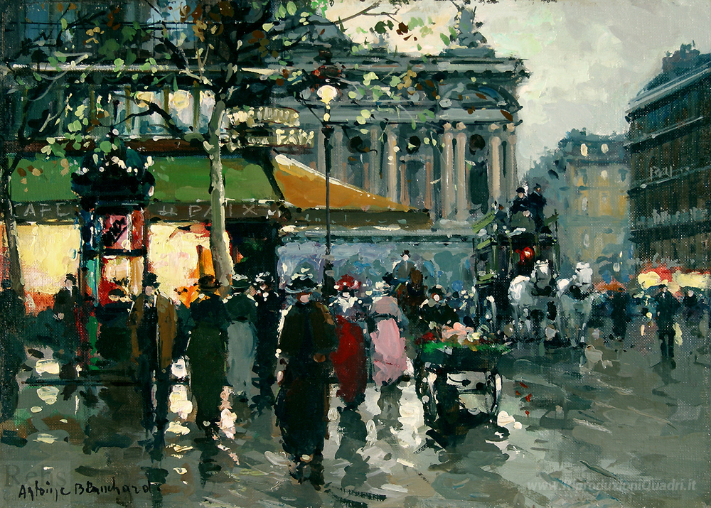 Ti offriamo una riproduzione artigianale su tela dell'opera famosa 'Café de la Paix' di Antoine Blanchard, dal Museo delle Riproduzioni.