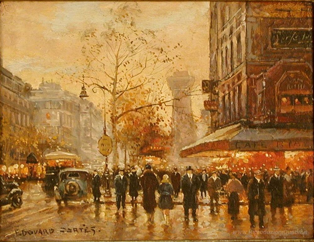 Ti offriamo una riproduzione artigianale su tela dell'opera famosa 'Caf de la Paix, Parigi' di Edouard Cortes, dal Museo delle Riproduzioni.
