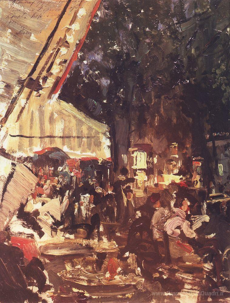 Ti offriamo una riproduzione artigianale su tela dell'opera famosa 'Caffè' di Konstantin Korovin, dal Museo delle Riproduzioni.