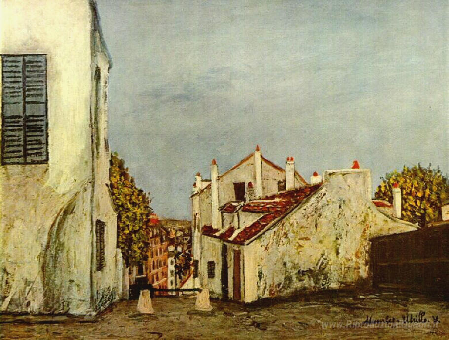Ti offriamo una riproduzione artigianale su tela dell'opera famosa 'Case a Montmartre' di Maurice Utrillo, dal Museo delle Riproduzioni.