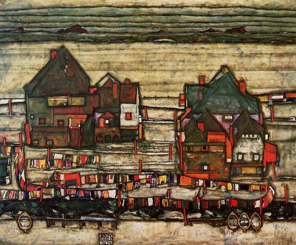 Ti offriamo una riproduzione artigianale su tela dell'opera famosa 'Case con lavanderia (Seeburg)' di Egon Schiele, dal Museo delle Riproduzioni.