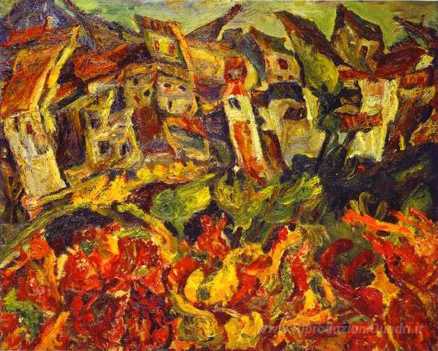 Ti offriamo una riproduzione artigianale su tela dell'opera famosa 'Case con tetti aguzzi' di Chaim Soutine, dal Museo delle Riproduzioni.