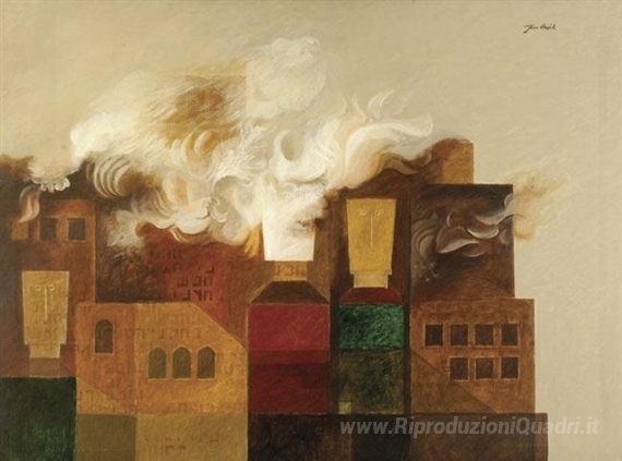 Ti offriamo una riproduzione artigianale su tela dell'opera famosa 'Case in fiamme' di Jean David, dal Museo delle Riproduzioni.