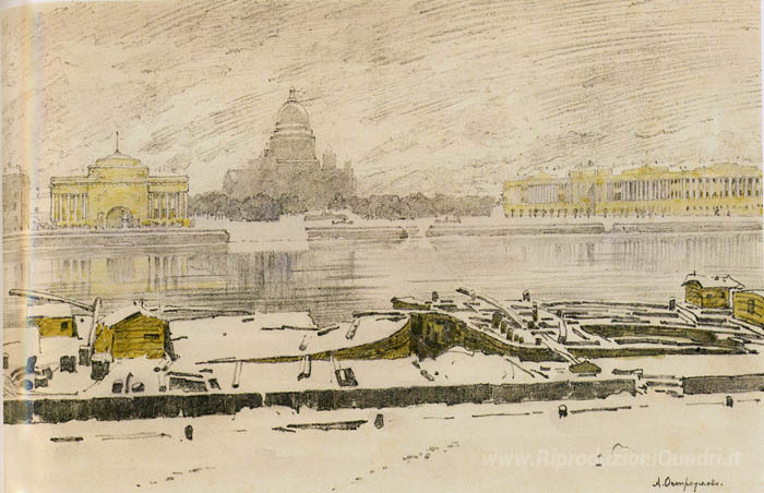 Ti offriamo una riproduzione artigianale su tela dell'opera famosa 'Cattedrale di Sant'Isacco in una giornata nebbiosa' di Anna Ostroumova-Lebedeva, dal Museo delle Riproduzioni.