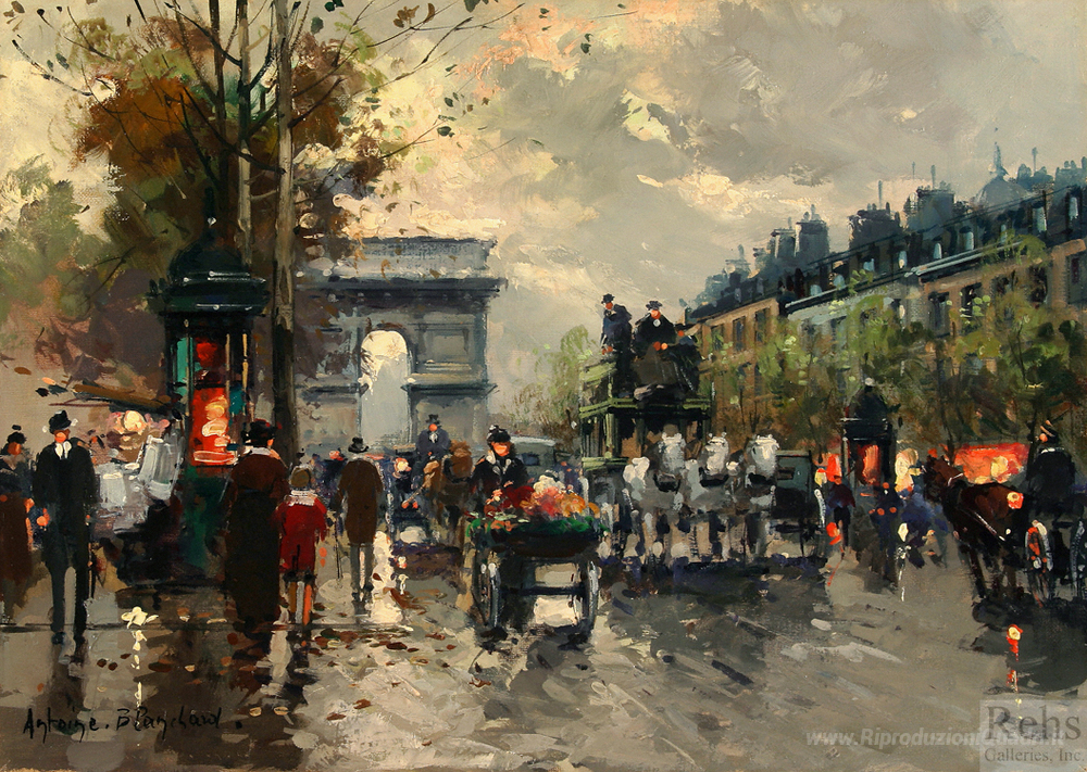 Ti offriamo una riproduzione artigianale su tela dell'opera famosa 'Champs Elysees, Arc de Triomphe' di Antoine Blanchard, dal Museo delle Riproduzioni.